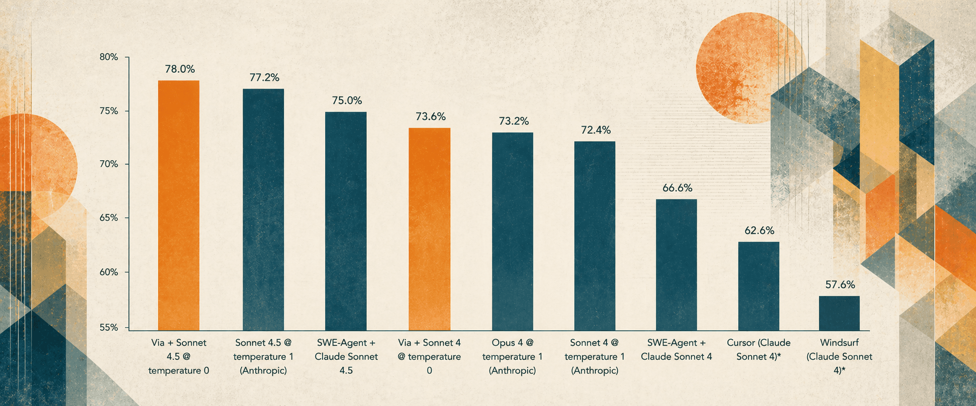 Through our algorithms, Via held the #1 rank on SWE-Bench Verified, the primary benchmark for assessing agentic coding, from June to December of 2025. The algorithms developed by Shray, Ila, and the incipient Via team outperformed Anthropic, OpenAI, and Google on their own LLMs, even as new generations of models were released. Via produced the most accurate code in the world.